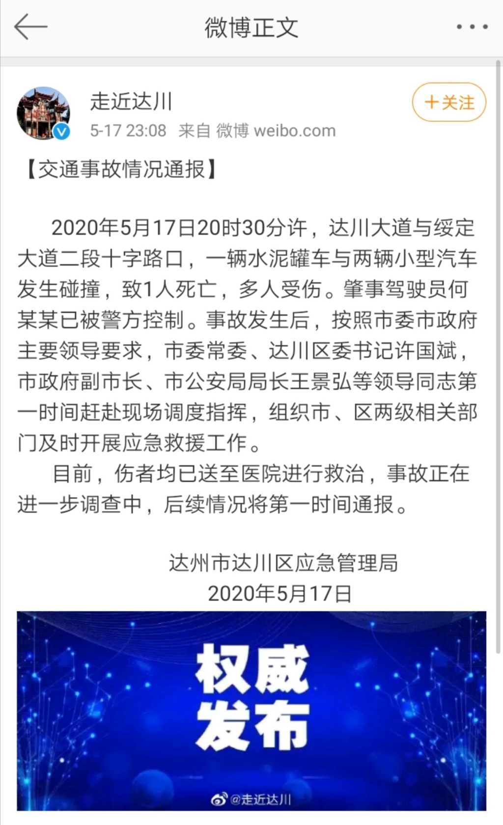 2020年5月17日20时30分许,达川大道与绥定大道二段十字路口,一辆水泥罐车与两辆小型汽车发生碰撞,致1人死亡,多人受伤。肇事驾驶员何某某已被警方控制。(早前报道>>突发!达州城区水泥罐车失控,撞上多台车辆、冲进门市)