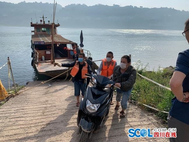 合江县望龙镇市民裴声走在最后。他推着一辆摩托车,从轮船上伸到渡口的垫板上小心翼翼地通行,垫板太窄,车太沉,裴声差点摔倒,船工黄大山见状赶紧搭了一把手,裴声才稳住重心,顺利地推着车到了地面。