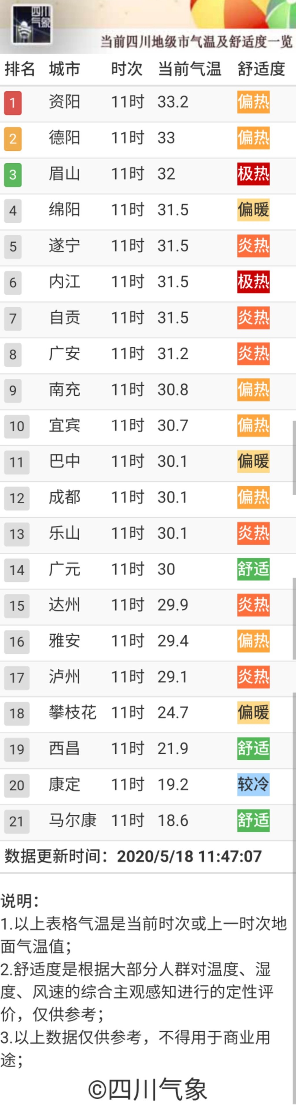 四川在线消息(记者 陈婷)今天又是四川各地竞争高温TOP榜的一天。接近中午12点的时候,资阳市、德阳市、眉山市的气温冲在了全省21个城市最前列: