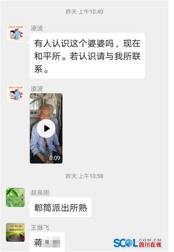 “有人认识这个婆婆吗,现在在和平所。若认识请与我所联系”!郫都公安分局内部微信群响起了和平街派出所教导员凌波的求援信息。几分钟后,郫筒派出所所长赵良刚、教导员王继飞应答,“蒋某某”“1926年6月生,以前送过她找到了家。”