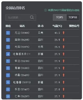 四川在线消息(记者 陈婷)来自四川省气象局的资料显示,昨日(5月18日),四川盆地有超过40个地区发布高温橙色预警信号。当天16时的全国高温排行榜上,我大四川在前十名中一举拿下6个名额,其中简阳以39.5℃的气温名列第二。