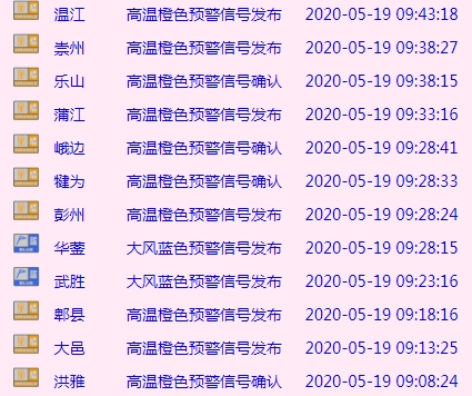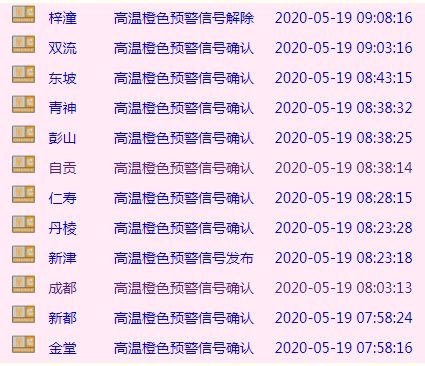 5月19日早上,成都、自贡、眉山、乐山的市、县两级气象台继续发布高温橙色预警信号,当地今天仍将处于“烧烤”模式中,预计日最高气温将达到35℃或38℃以上。