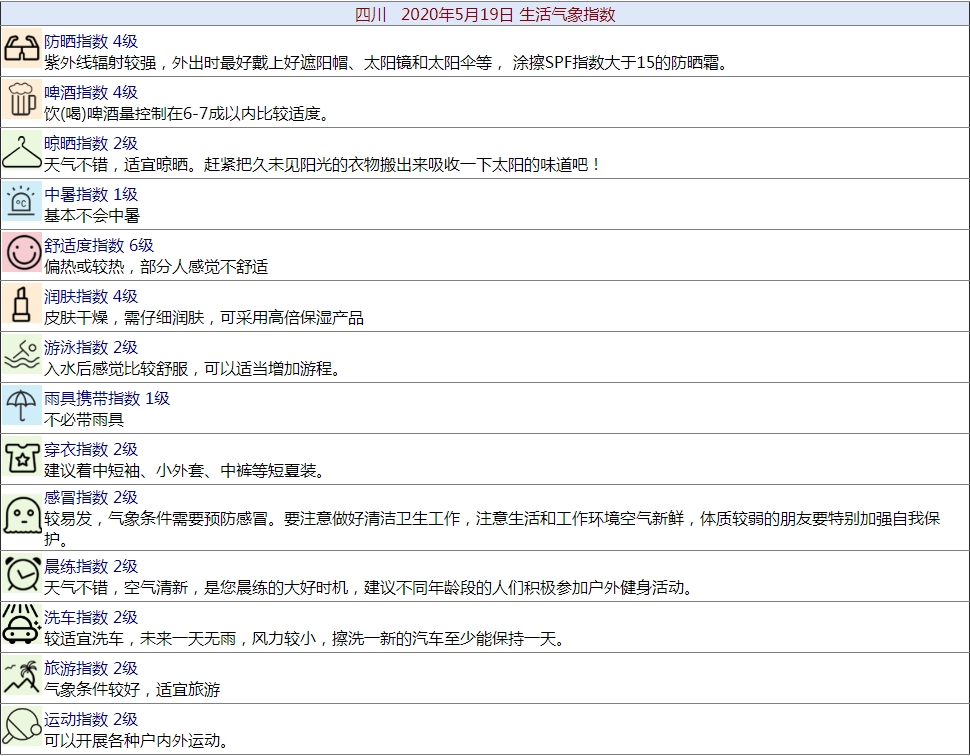四川省公共气象服务中心贴心地为大家制定了今天的各种生活指数,朋友们参考一下~
