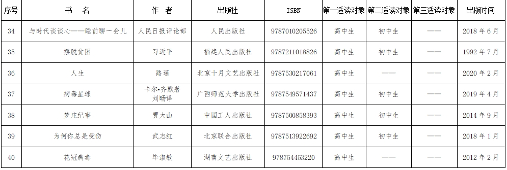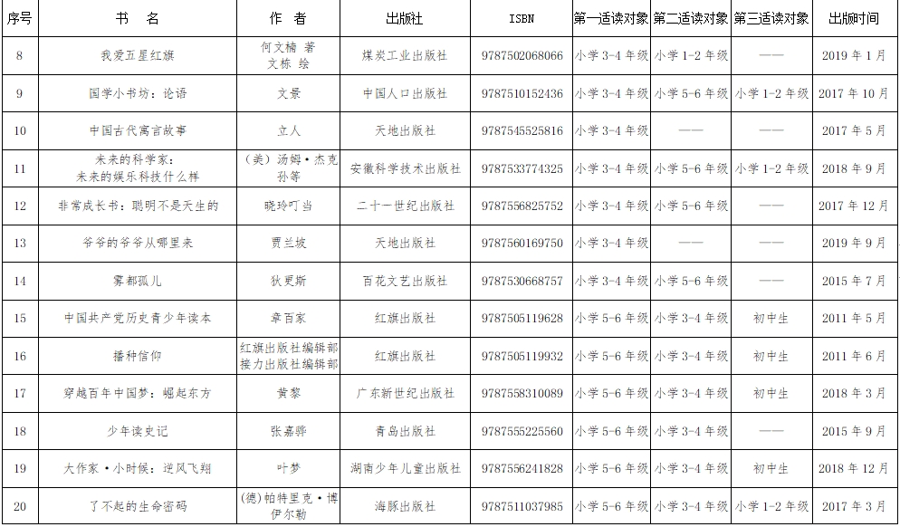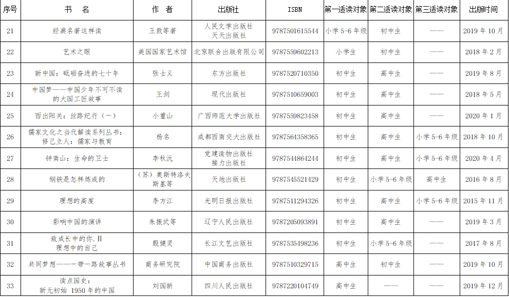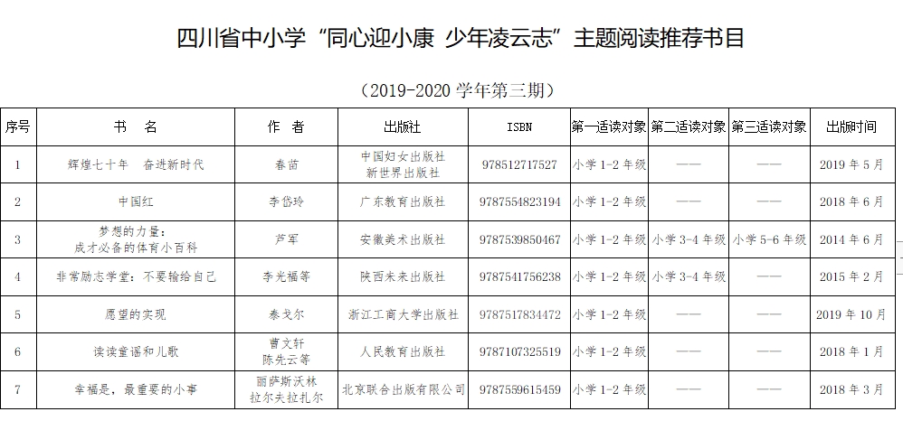 记者5月19日从四川省教育厅获悉,日前,教育厅印发了四川省中小学2019-2020学年第三期主题阅读推荐书目,即四川省中小学“同心迎小康 少年凌云志”主题阅读推荐书目。