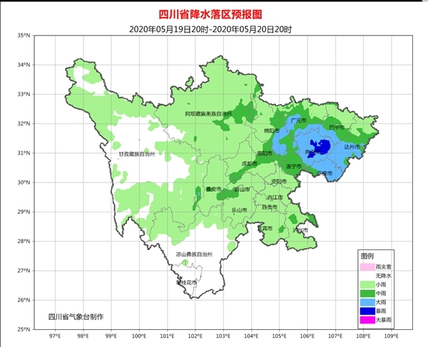 5月20日白天,盆地各市多云间阴,部分地方有阵雨或雷雨,其中雅安、眉山2市部分地方有中雨;川西高原和凉山州北部多云间阴有分散阵雨或雷雨,攀西地区其余地方多云间晴。