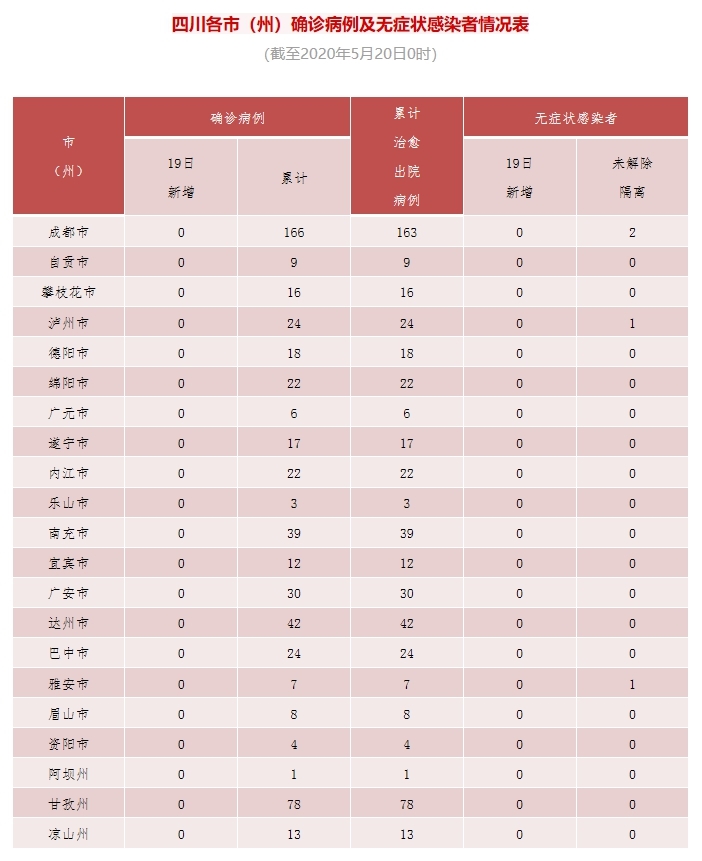 四川在线消息(记者 石小宏 殷鹏)5月20日,记者从四川省卫健委获悉,5月19日0-24时,四川无新增新型冠状病毒肺炎确诊病例,无新增疑似病例。