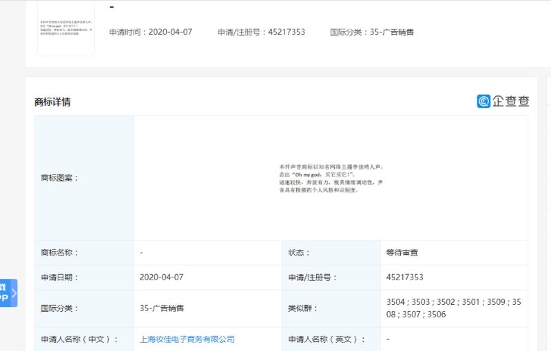 这几天,“口红一哥”李佳琦为“Oh my god,买它买它!”这句口头禅申请声音商标的事情在网上引起了网友议论,“企查查”提供的数据显示,目前该申请处于等待审查的状态。