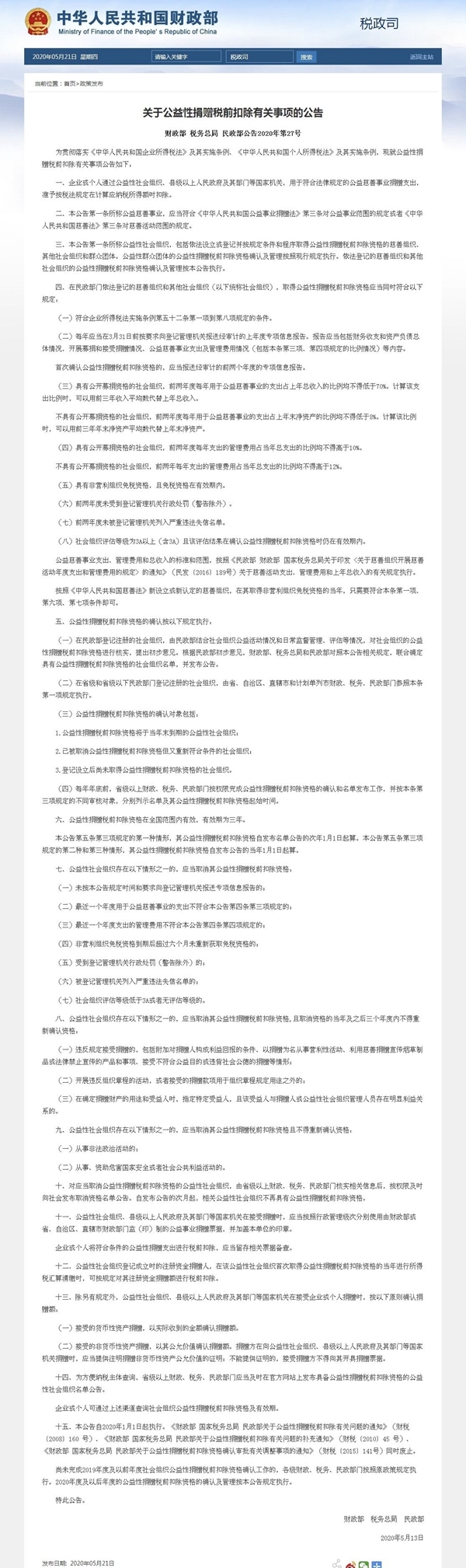 近日,财政部、税务总局、民政部印发《关于公益性捐赠税前扣除有关事项的公告》(以下简称《公告》),明确企业或个人通过公益性社会组织、县级以上人民政府及其部门等国家机关,用于符合法律规定的公益慈善事业捐赠支出,准予按税法规定在计算应纳税所得额时扣除。扣除资格在全国范围内三年有效。
