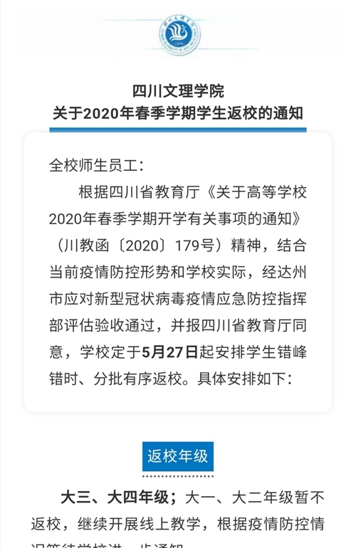 四川在线消息(记者 袁城霖)5月21日,四川文理学院发布2020年春季学期学生返校的通知,定于5月27日起安排学生错峰错时、分批有序返校。