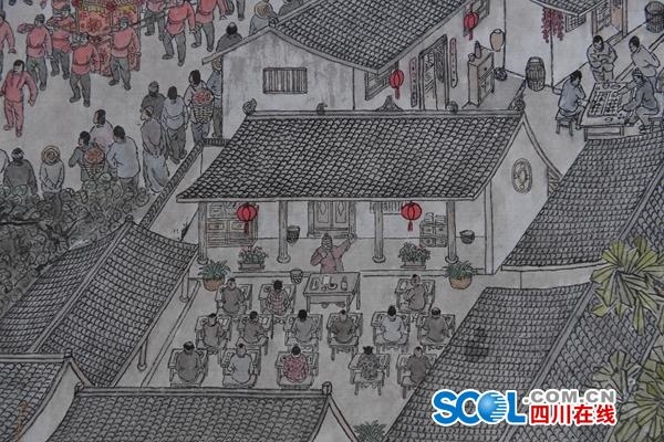 除了人物以外,建筑也是《柏社古镇墨踪》一大亮点。在柏社古镇街道两侧,分布着火神庙、地方会馆、南华宫、茶馆和川西四合院民居,青瓦白墙错落有致。据舒增尧介绍,光是每一个屋顶上层层叠叠的小青瓦,就要画整整一个上午。有时候眼睛画疲劳了,他就歇下来喝口茶,关注一下实时疫情,在客厅走动走动,然后又继续作画。