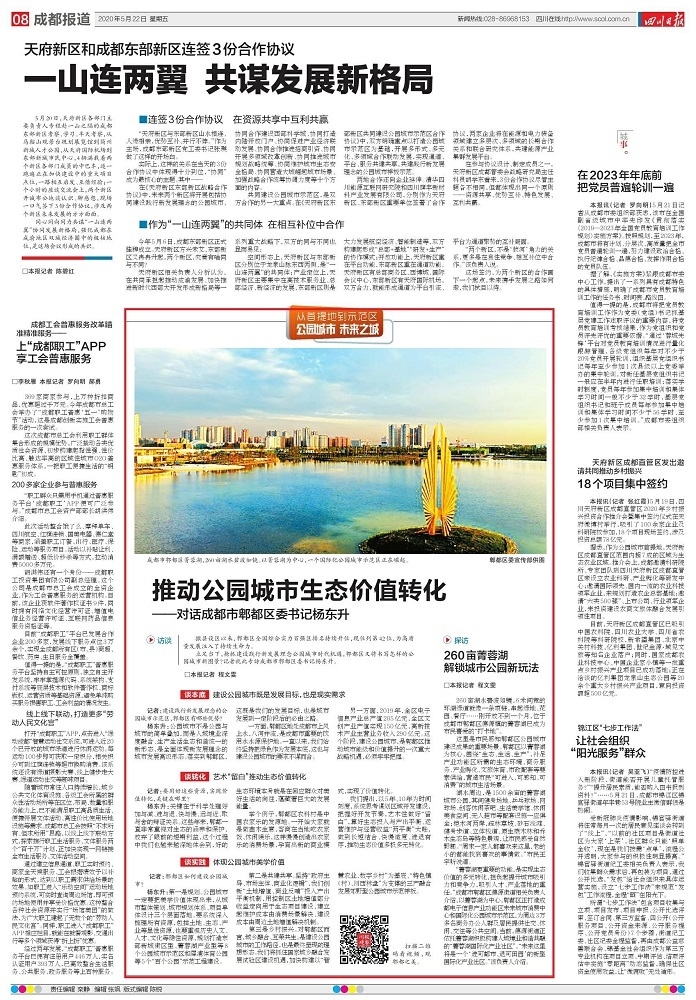 杨东升:第一是规划。公园城市一定要把美学价值体现出来。我们提出从城市整体策划、城市规划体系、项目单体设计三个层面层层落地,扮靓我们的城市。这个过程中,要系统深入梳理所有资源,包括各类土地、生态、产业等显性资源,也要重视历史人文、人才、文化等隐性资源,还包括未来聚集于此的科教、卫生、产业、消费等各类潜在资源。围绕加快提升城市功能品质,我们将分类推进公园城市示范区建设,规划打造东部新城街区型、菁蓉湖产业型等8个公园城市示范区和犀浦体育公园等5个“百个公园”示范工程建设。