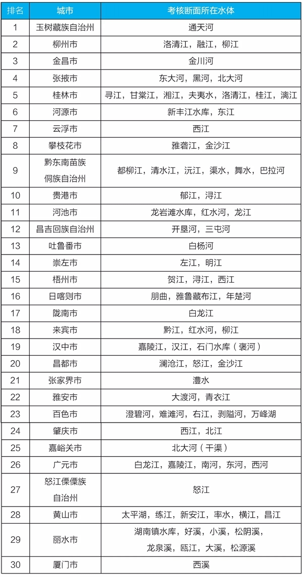 从2019年5月起,除了“大气排名”,生态环境部开始发布一个新的“水质排名”,即对全国地级及以上城市的地表水考核断面的水环境质量以及变化情况进行排名,此项排名共涉及333个城市。