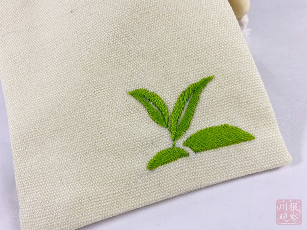 全场100多位代表的视线几乎同时聚焦到这个巴掌大小的精致茶包:米白色的布袋上,绣着两片青翠欲滴的绿色茶叶。做工讲究,那是国家级非物质文化遗产——广元“麻柳刺绣”。