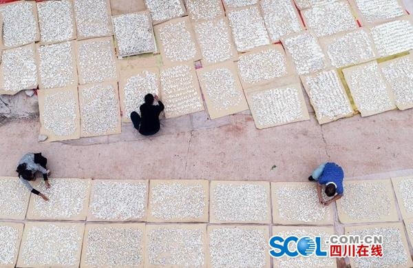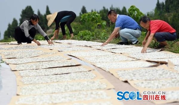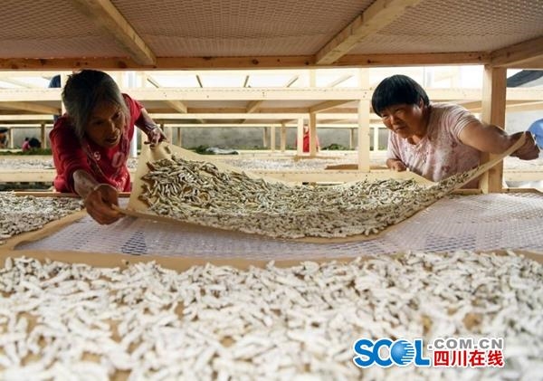 四川在线消息(刘永红 记者 李向雨 摄影报道)5月22日,记者在南充市蓬安县兴旺镇黑白寺村蚕桑扶贫产业园一间蚕房看到,村民们或分拣僵蚕或摆顺调形或准备晾晒,现场一片忙碌。