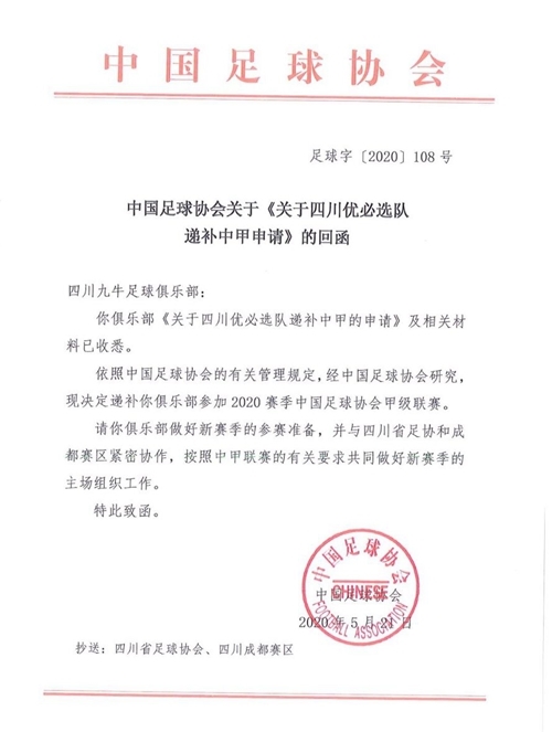 就在刚刚,俱乐部收到了中国足协的通知。我们非常高兴地告知大家,四川优必选获得2020赛季中国足球协会甲级联赛参赛资格。中甲,四川优必选来了!