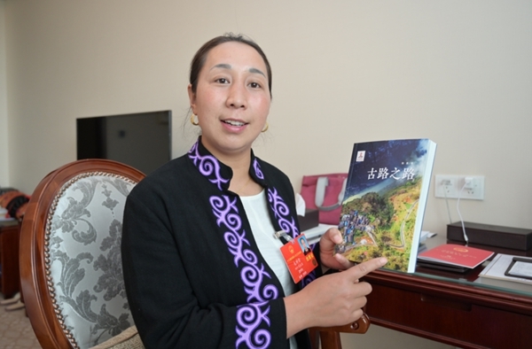 5月23日上午,十三届全国人大三次会议四川代表团第一次代表小组会议第四小组会场,全国人大代表、石棉县栗子坪彝族乡公益村妇联主席毛珍芳在发言,先从文件袋里抽出厚厚一本《古路之路》。这本书讲述的是距离公益村几十公里的汉源县永利乡古路村的故事。(新闻链接:从一幅照片到一本书 两位全国人大代表与一个村庄的“接力晒”)
