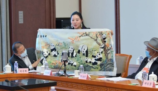 开包展开,一幅1米见方的绣品映入众人眼帘。这是十多位绣娘近半个月的精心力作,绣品上大熊猫憨态可掬、栩栩如生。