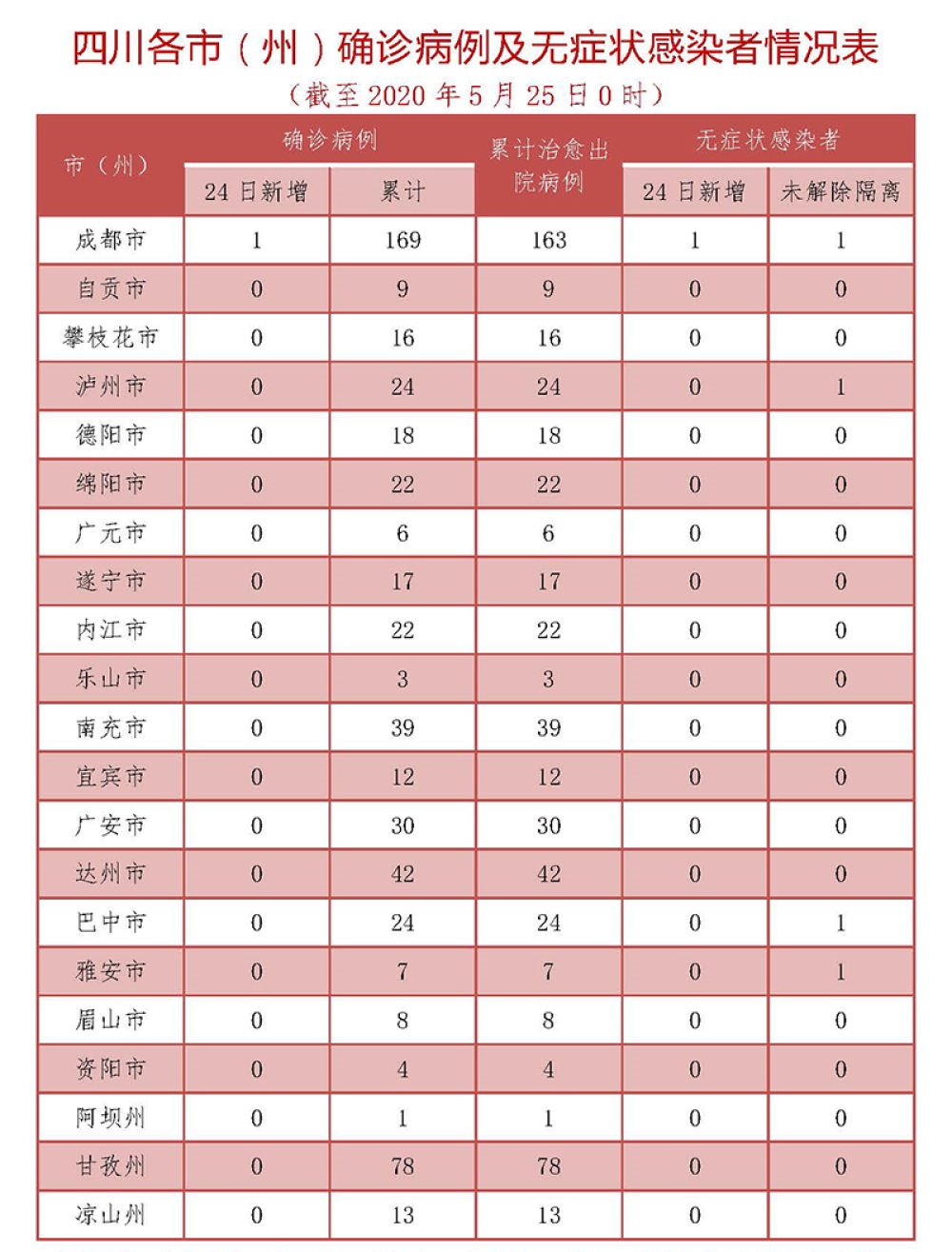 四川在线消息(记者 石小宏 殷鹏)5月25日,记者从四川省卫健委获悉,5月24日0-24时,四川新增新型冠状病毒肺炎确诊病例1例(为境外输入),无新增治愈出院病例,无新增疑似病例,无新增死亡病例。