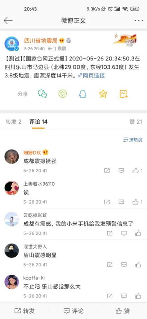 5月26日,记者从四川地震局微博获悉,05月26日20时34分在四川乐山市马边县(北纬29.00度,东经103.63度)发生3.8级地震,震源深度14千米。