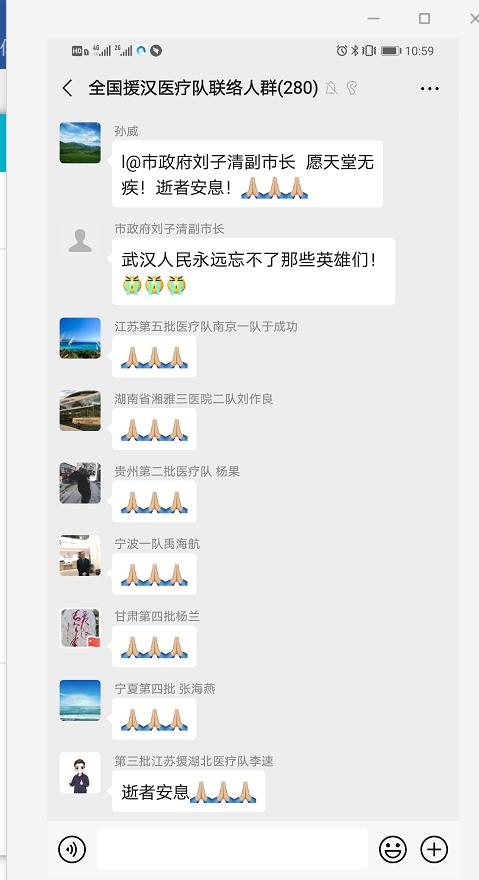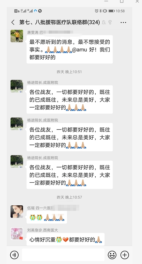 “虽然我们和没有在一个医院战斗,但是并不影响我们一起为武汉拼过命的那份感情。” 陈心足对记者说,从2月份从新闻上得知梁小霞晕倒以后,3个月过去,大家都一直在挂念她,没有想到再听到消息竟然是噩耗。从陈心足的微信聊天截图中,记者看到从昨天到今天,大家的留言一直不断,纷纷表示对梁小霞的哀悼之情。