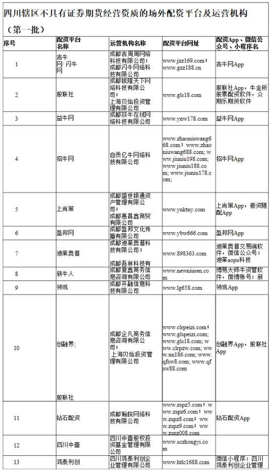 四川在线消息(彭瑀珩)5月27日,四川证监局在其官网发布了《四川证监局公示辖区2020年度第一批不具有证券期货经营资质的机构名单》,包括13个场外配资平台,涉及18家公司。