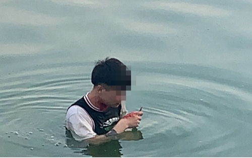 救援 现场救援人员利用男子接酒的时机一下把轻生男子按在水里,消防员在水里控制轻生者。