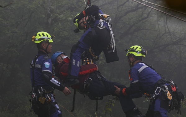 山岳救援大队接到救援命令后迅速反应,高空救援组迅速穿戴好个人防护工具,携带垂直救援设备及通讯器材,与地面救援组一同赶赴3号支架。到达3号支架处,地面救援组对被困吊厢中的乘客进行喊话安慰和心理安抚,防止其在吊厢内做出过激行为。高空救援组上支架后,通过搭建牵引绳索降至缆车上,然后在缆车与地面之间搭架绳桥,最后为2名“被困者”穿戴好安全防护装备后通过绳桥将其营救至地面安全区域。