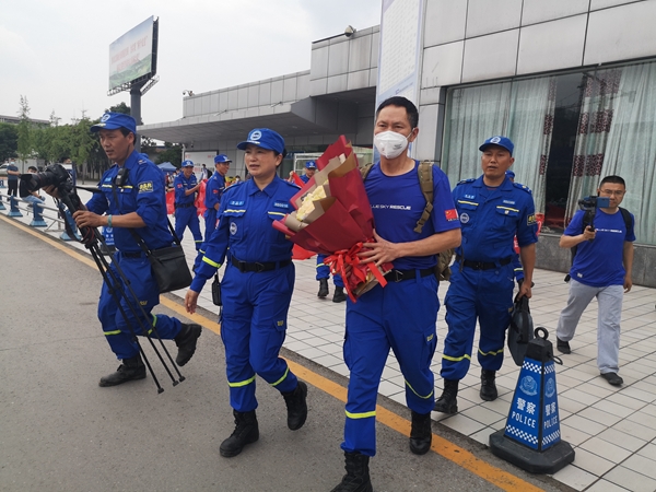 符必明走出通道,早已等候在此的迎接人员将鲜花递到他手中、拥抱。“欢迎援柬最美逆行者符必明回家” “蓝衣执甲 千里逆行 燕归花开 光荣凯旋”“青山一道 共担风雪 带来温暖力量”……达州红十字蓝天救援队数十名队员拉着横幅,欢迎援外抗疫英雄归来。