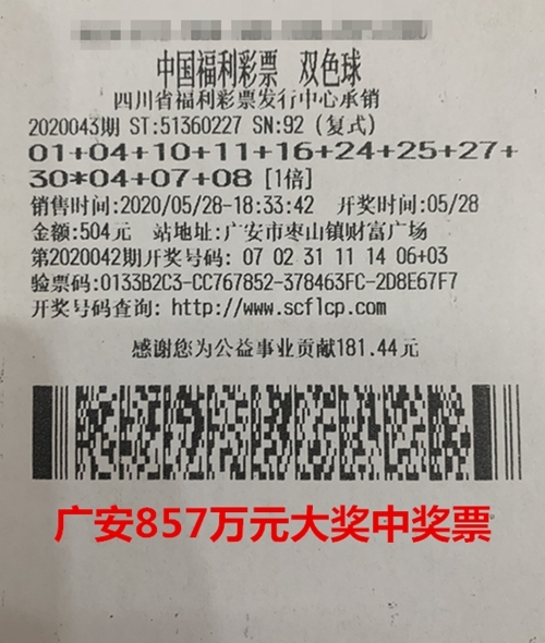 5月28日晚,双色球第2020043期开奖,开出的红球号码是01 、11、 24 、25、 27 、30 ,蓝球号码是07。位于广安枣山镇财富广场福彩51360227号投注站即刻炸开了锅,该站8位彩民“9+3”复式合买喜中当期一等奖,拿下总奖金857万余元。令人兴奋的是,这不仅是广安史上首个合买一等奖,也是今年四川的首个双色球合买一等奖。