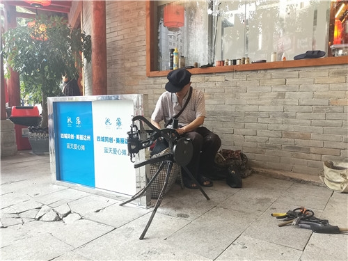 新桥社区茂华街某火锅店门前,77岁市民王登明的修鞋、擦鞋摊点,同样有天蓝色围挡固定。此前,王登明的摊点在两三米开外的大树下。“我们跟火锅店老板商量,把摊点移到门店的屋檐下,这样可遮风挡雨。”杜棚说。