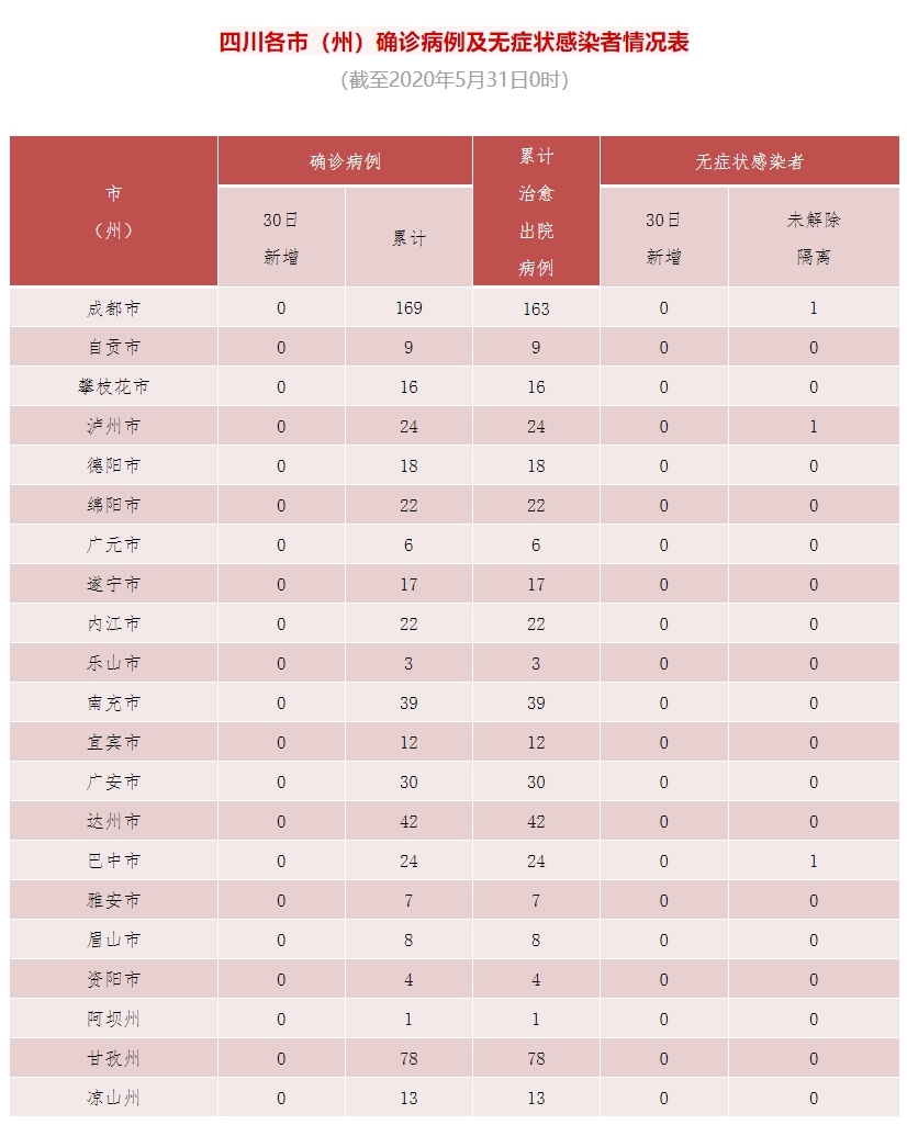四川在线消息(记者 石小宏 殷鹏)5月31日,记者从四川省卫健委获悉,5月30日0-24时,四川无新增新型冠状病毒肺炎确诊病例,无新增治愈出院病例,无新增疑似病例,无新增死亡病例。
