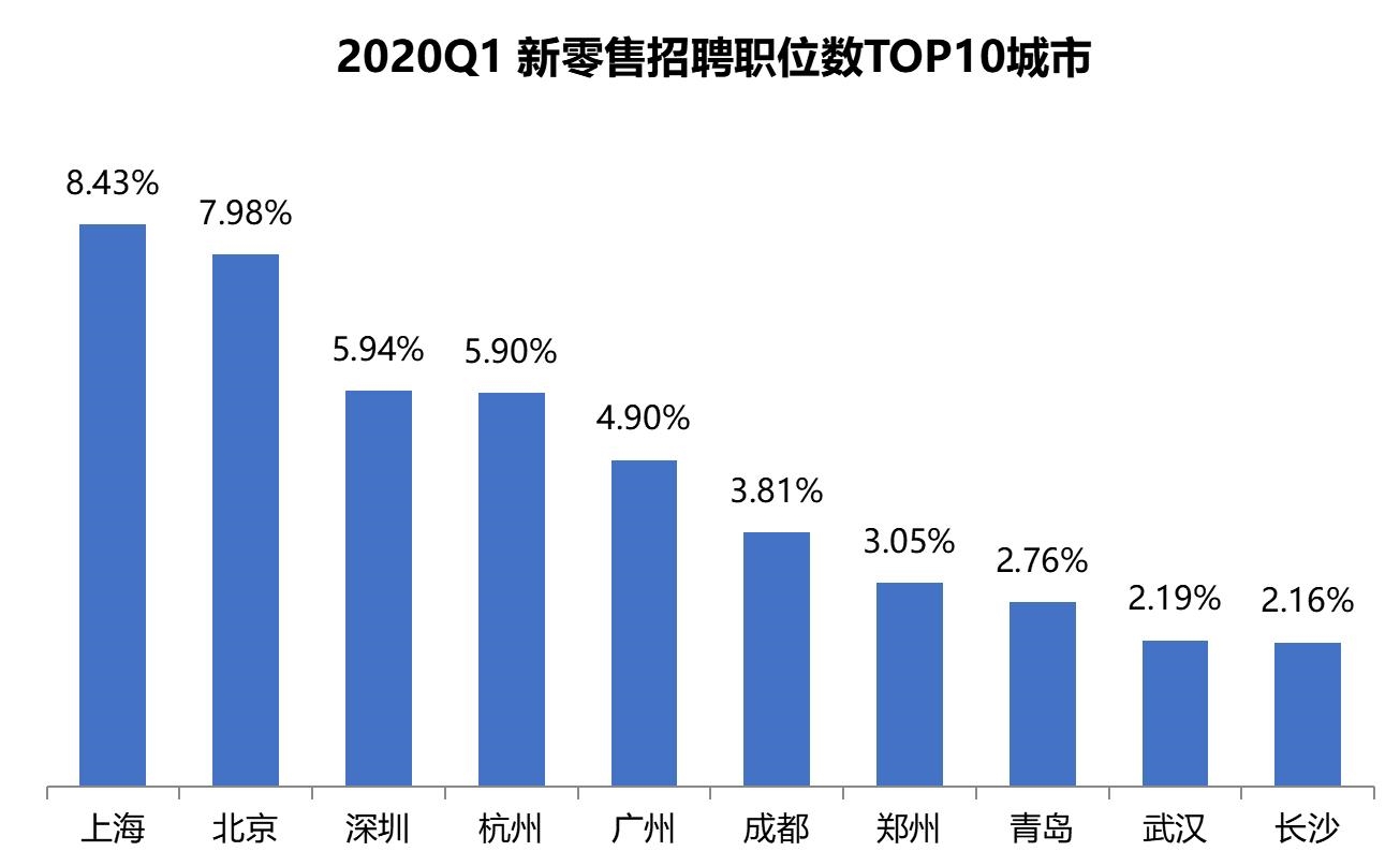 与此同时,报告显示四五线城市新零售人才招聘占比有所萎缩,新一线城市占比明显提升且在2020年一季度超越一线城市,可见新一线城市作为区域消费中心也是新零售产业重点布局所在地。