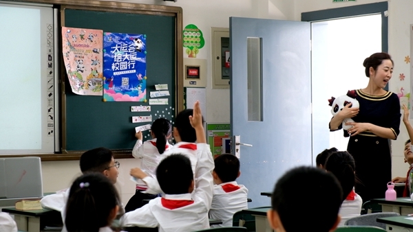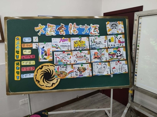而深入到美术课现场,各个学校老师们也“借东风”让课堂更加别开生面。新津华润小学五年级一班的美术课上演了“各国选手来参赛,奋勇争先夺第一”的运动“故事会”;龙泉驿区十陵小学的老师干脆在课堂上穿着熊猫服与学生互动,鼓励大家进行创作;哈密尔顿麓湖小学的美术老师吉薇羲带领同学们集全班之力,将众多画作剪贴组成了一幅五彩斑斓的大运会全图……团结友爱协作进取的体育精神在活动中悄悄感染了现场每一个孩子。