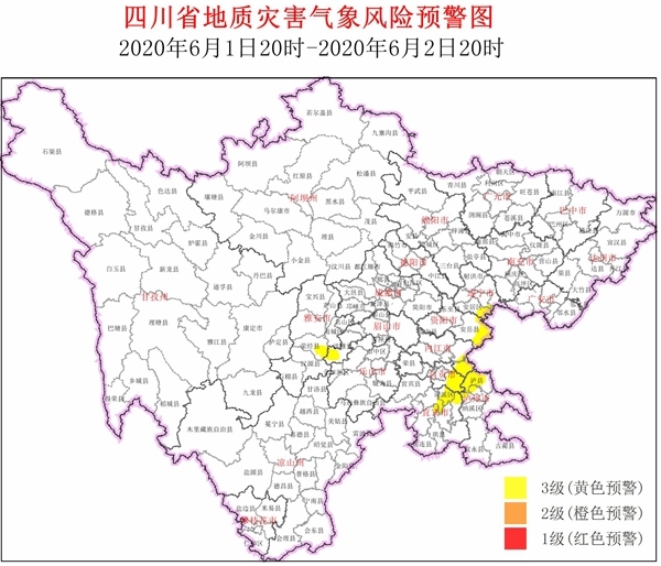 6月1日,四川正式进入主汛期,雨水也如期来临。省地质灾害指挥部办公室发布全省地质灾害气象风险预警。结合四川省气象台天气预报情况,6月1日20时~6月2日20时,全省多地在黄色预警范围内,预警区域如下: