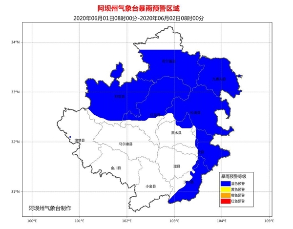 四川在线消息(记者 徐登林)6月1日,阿坝州气象台发布暴雨蓝色预警、小流域山洪气象风险预警和地质灾害气象风险预警。