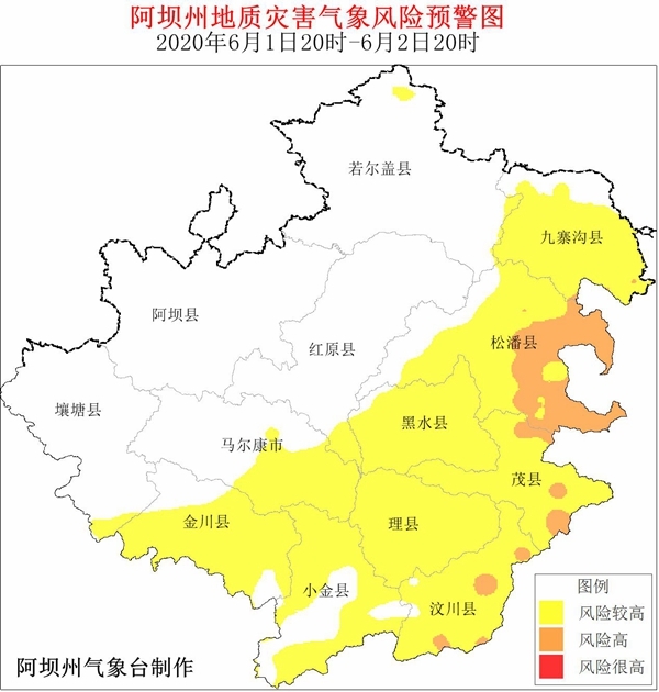 根据气象资料分析,6月1日20时-6月2日20时,汶川县、理县、茂县、松潘县、九寨沟县、金川县、小金县、黑水县、壤塘县、若尔盖县、红原县、马尔康市等12县(市)发生地质灾害气象风险等级较高,其中汶川县、茂县、松潘县、九寨沟县的部分地方发生地质灾害气象风险等级高。