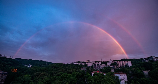 四川在线消息(记者魏冯)6月4日早晨,泸州各地出现绚烂朝霞,局地还出现了双彩虹。天空就像被顽皮孩子打翻了的颜料盒,染上了橙、红、灰、紫、蓝等颜色。