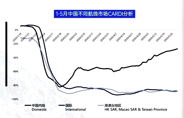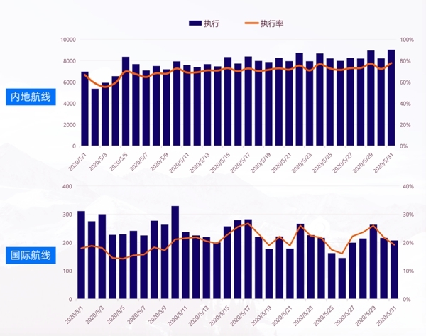 报告分析认为,5月,京津冀下调应急响应等级带动商务出行增加,中国内地航线航班执行量平稳上升,平均执行率逾70%;另一方面,受海外疫情及出入境政策限制,中国内地通航国际航班量仍呈疲软态势,平均执行率仅20.3%。
