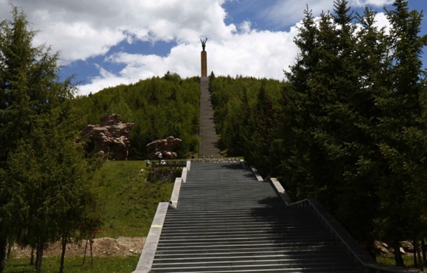 6月5日中午,阳光灿烂,天空湛蓝。松潘县川主寺镇元宝山上青松挺拔,翠柏成荫,青草绵绵。呼吸着松柏特有的清香,顶着烈日的曝晒,经过20多分钟费力攀登,高高耸立在元宝山顶的红军长征纪念碑,近在眼前。长长的基座上,一名红军战士一手举枪,一手握花,双手高举成“V”字形,指向苍穹,黑色伟岸身躯与蓝色天空形成鲜明对比。