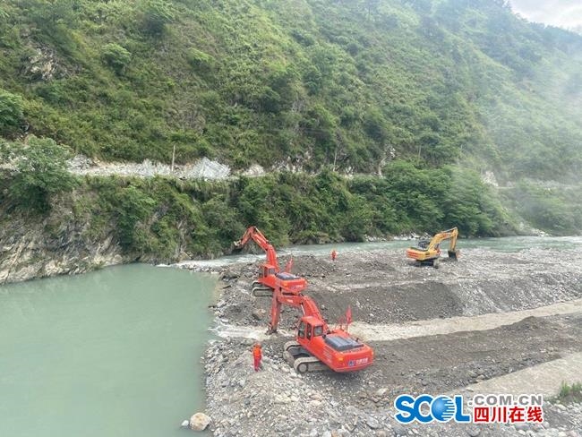 经过专家组和前方指挥部的分析研判,此次堰塞湖抢险采取挖爆结合、双侧成槽的抢险方式。抢险组立即在堰塞湖下游布置爆破点。“5、4、3、2、1!”上午11点,一声巨响,工程抢险组实施爆破,堰塞湖成功泄洪,随后,三台挖掘机在堰口处清理砂石。至此,堰塞湖抢险演练完毕。