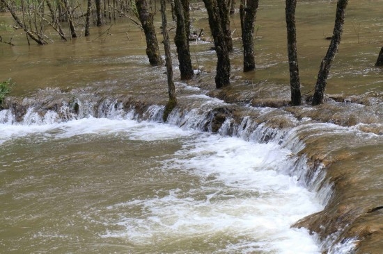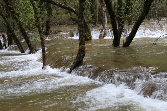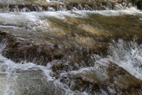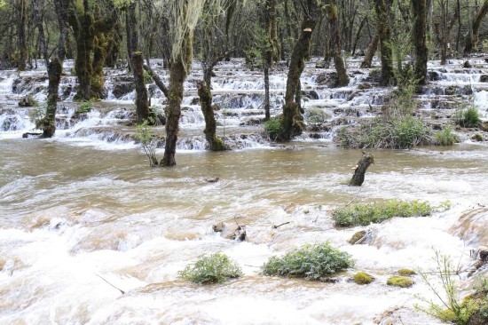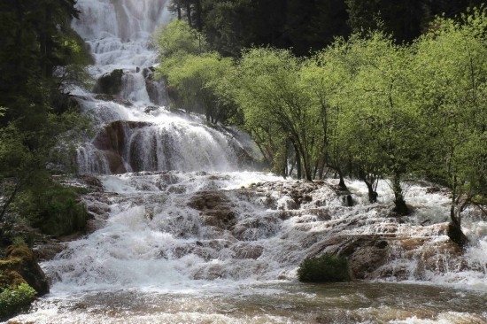 离开汹涌如雷、气势磅礴的扎嘎瀑布,在其下游可以看见气象万千、温文尔雅的层层池潭。什么象鼻潭、溢彩池、双龙潭、池中莲台等,名如其形。这里处处清池层叠,林木葱葱,泉水漫流,白练飘动,神韵奇谲。