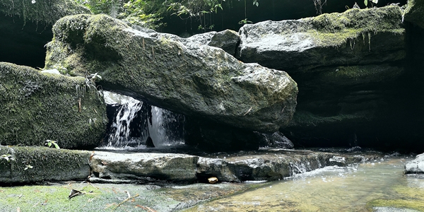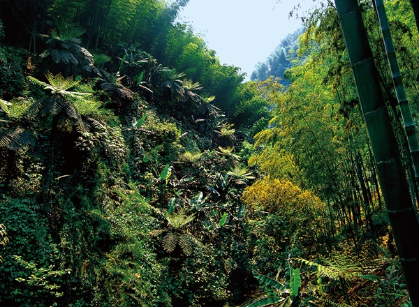 进入沟口,修竹千杆,桫椤遍野,美丽的凉姜花竞相开放。在梦幻般的沟谷中,时而林茂沟深浓荫蔽日,宛如穿行于热带雨林一般,时而又豁然开朗,秀水潺潺,绿草如茵,端庄恬美。