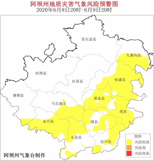 根据气象资料分析,6月8日20时-6月9日20时,汶川县、理县、茂县、松潘县、九寨沟县、金川县、小金县、黑水县、壤塘县、红原县、马尔康市等11县(市)发生地质灾害气象风险等级较高,其中茂县、松潘县的部分地方发生地质灾害气象风险等级高,请注意预防。