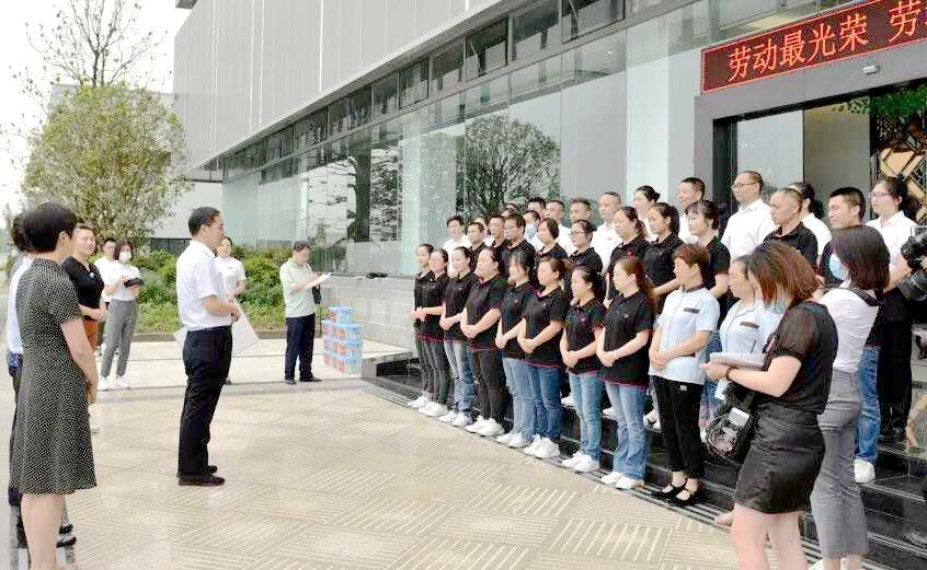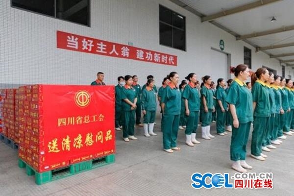 在眉山市,省总工会送清凉慰问组一行还来到四川丽妍工坊生物科技有限公司、四川省惠通食业有限责任公司生产车间,为一线职工送去清凉礼包,向冒着高温辛勤工作的各行各业职工表示敬意和慰问。