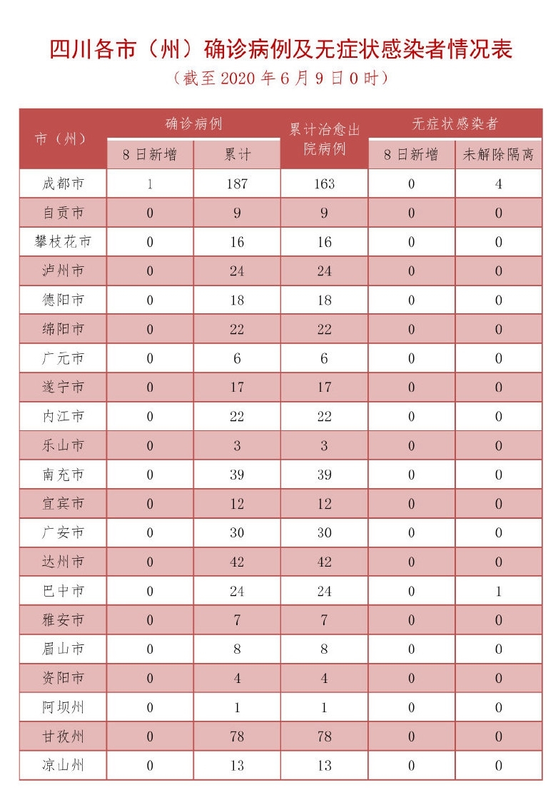 四川在线消息(记者 石小宏 殷鹏)6月9日,记者从四川省卫健委获悉,6月8日0-24时,四川新增新型冠状病毒肺炎确诊病例1例(境外输入,为6月7日的无症状感染者转确诊),无新增治愈出院病例,无新增疑似病例,无新增死亡病例。