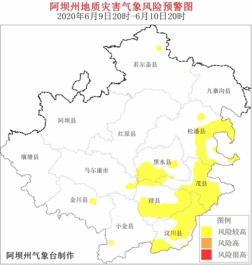 根据气象资料分析,6月9日20时-6月10日20时,汶川县、理县、茂县、松潘县、金川县、小金县、黑水县、若尔盖县、红原县、马尔康市等10县(市)发生地质灾害气象风险等级较高,请注意预防。