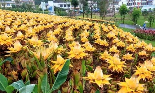 “碧叶如芭蕉,假茎生荷花”,千叶佛莲又名地涌金莲,是佛教寺院中的“五树六花”之一。千叶佛莲的奇特之处在于其花序,有金黄色苞片的花序直接着生在粗壮的假茎(地上部分)顶端,形如花瓣,层层由下而上,逐渐展开,鲜艳美丽而有光泽,恰如一朵盛开的莲花。遂宁市蓬溪县拱市村,昔日的贫困村,如今引进培育的千叶佛莲已开满村庄。据悉,拱市村千叶佛莲规模种植5000余亩,成为亚洲最大的千叶佛莲种植基地,佛莲远销北京、天津等地。