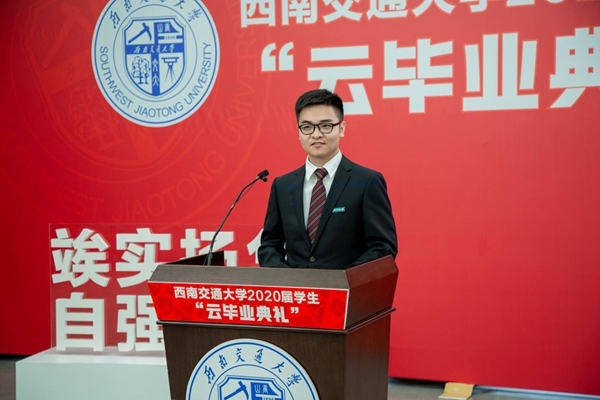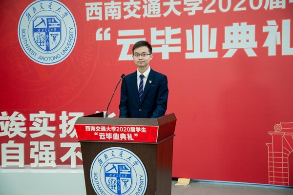 四川在线消息(王聪 李鲁昱 雍腾 记者 李丹)6月10日上午,西南交通大学2020届“云毕业典礼”通过线上“云播”方式举行。本次毕业典礼没有现场观礼的学生和家长,没有宽阔的场馆和热闹的布置,但庄严隆重的毕业氛围没有变,交大对即将远行学子的不舍与牵挂没有变。身在各地的毕业生们心系一处,守候在屏幕的另一端与母校共同走过大学时光的最后节点,也终在母校的最后一次嘱托中,开启人生新篇章。