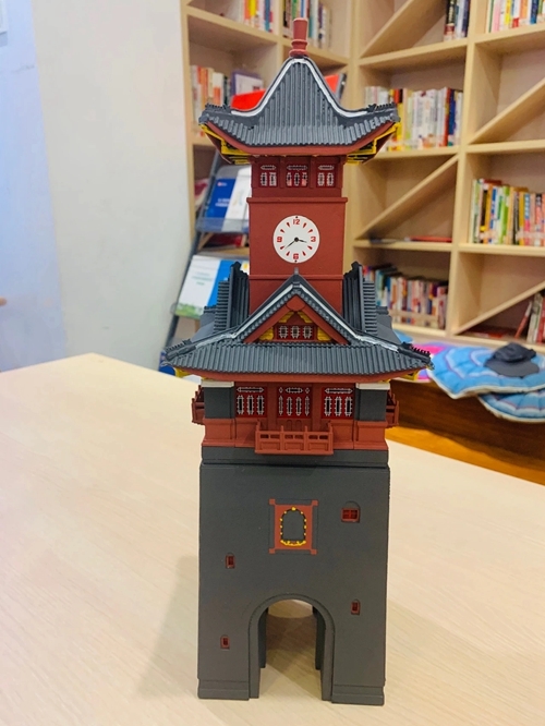 整个模型高38厘米,按照1:87的比例缩小,由273个高精度3D打印和激光切割零件装配而成。模型的屋檐墙角、红砖青瓦、雕栏玉砌……每一处细节都做到了精美还原,与真实的钟楼别无二致。