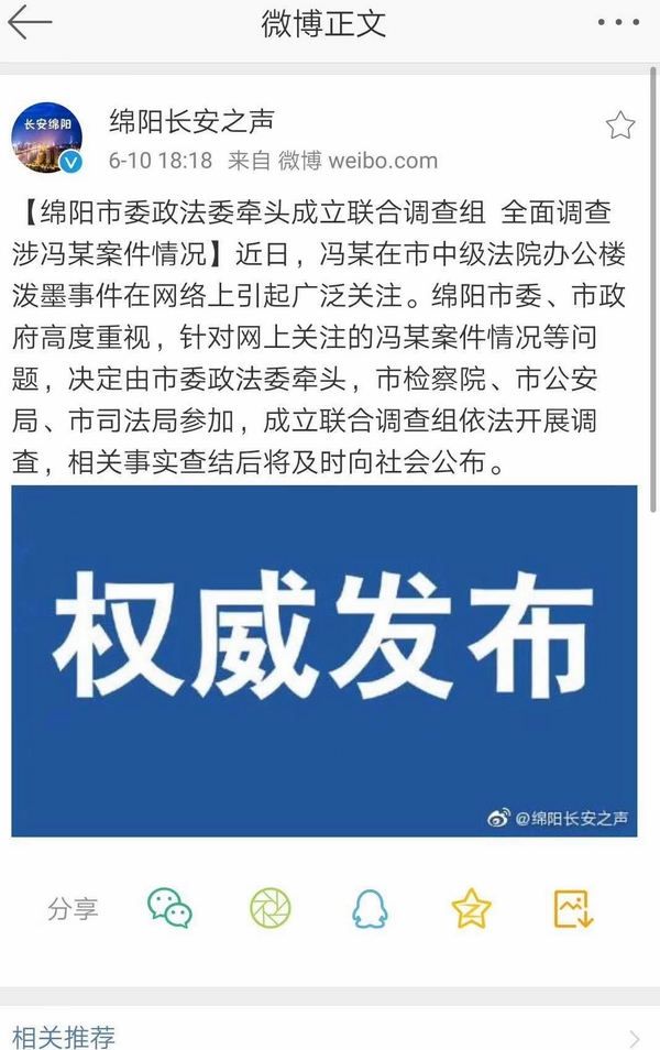6月10日下午18时许,绵阳市政法委官方微博“绵阳长安之声”发文称,针对冯某在该市中级法院办公楼泼墨事件,目前已市委政法委牵头,市检察院、市公安局、市司法局参加,成立联合调查组依法开展调查。